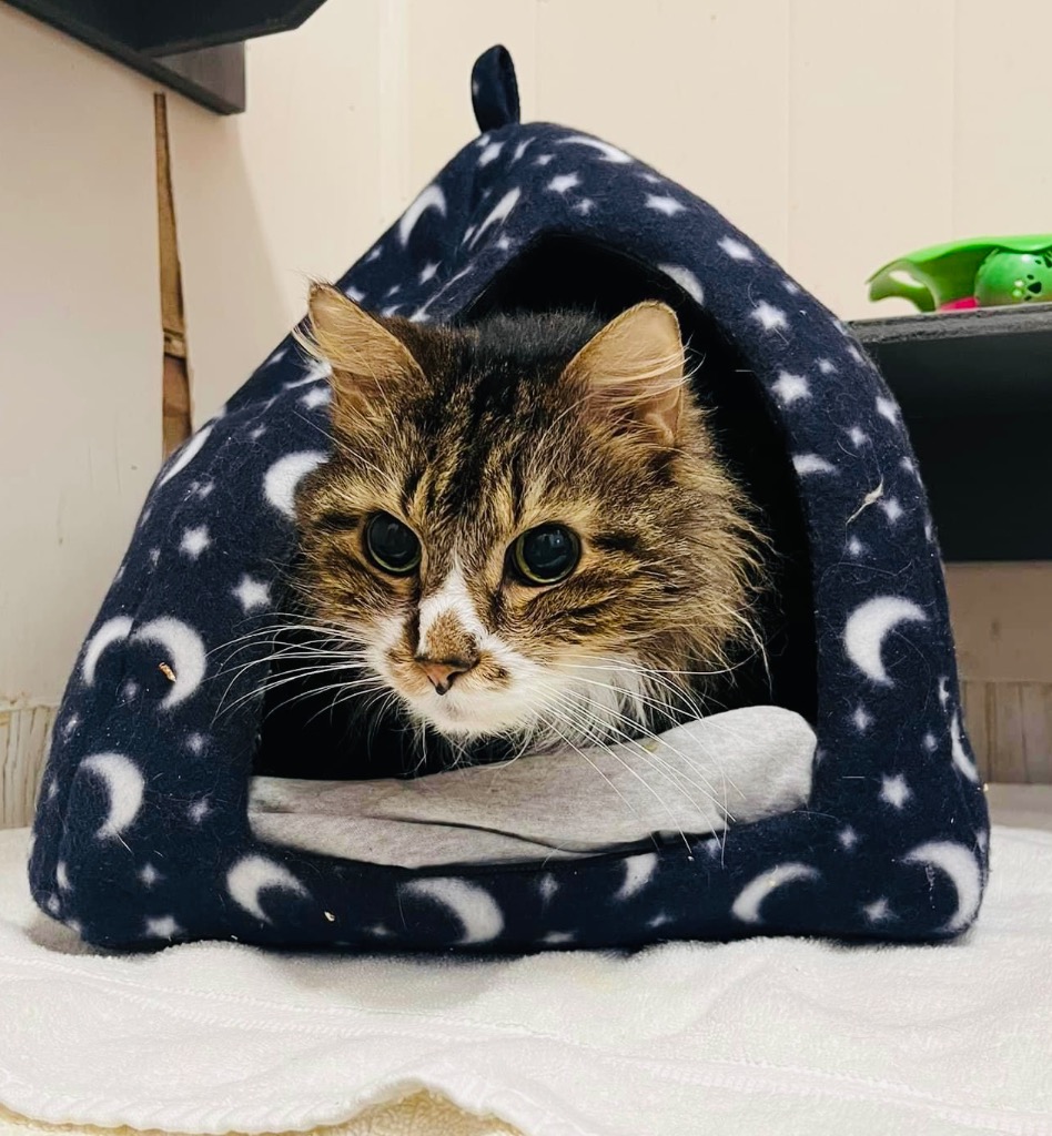 Seriously, can we talk??? That's Jessie's Girl!! She's a little chatterbox, maybe she's trying to tell us all about her past. This beautiful long-haired floofka adores love and attention. She isn't the kind of cat that likes to be ignored so probably best for a work-from-home or retired type of family.