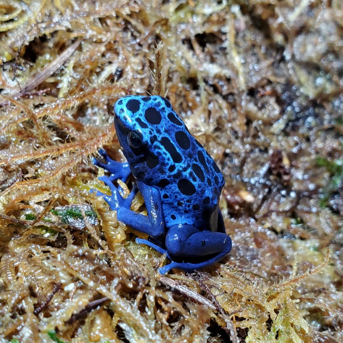 The black spots found on the poison dart frogs are unique to each frog and can be a way to identify each individual, although their spots can change slightly as they age. Did you know that poison dart frogs bred in captivity don’t actually have any dangerous toxins? The poison in the frogs found in their natural habitat is derived from their native diets, with the most toxic species feeding on ants, mites, and termites – all of which feed on the toxic plants found in their humid, tropical jungles in Central and South America.