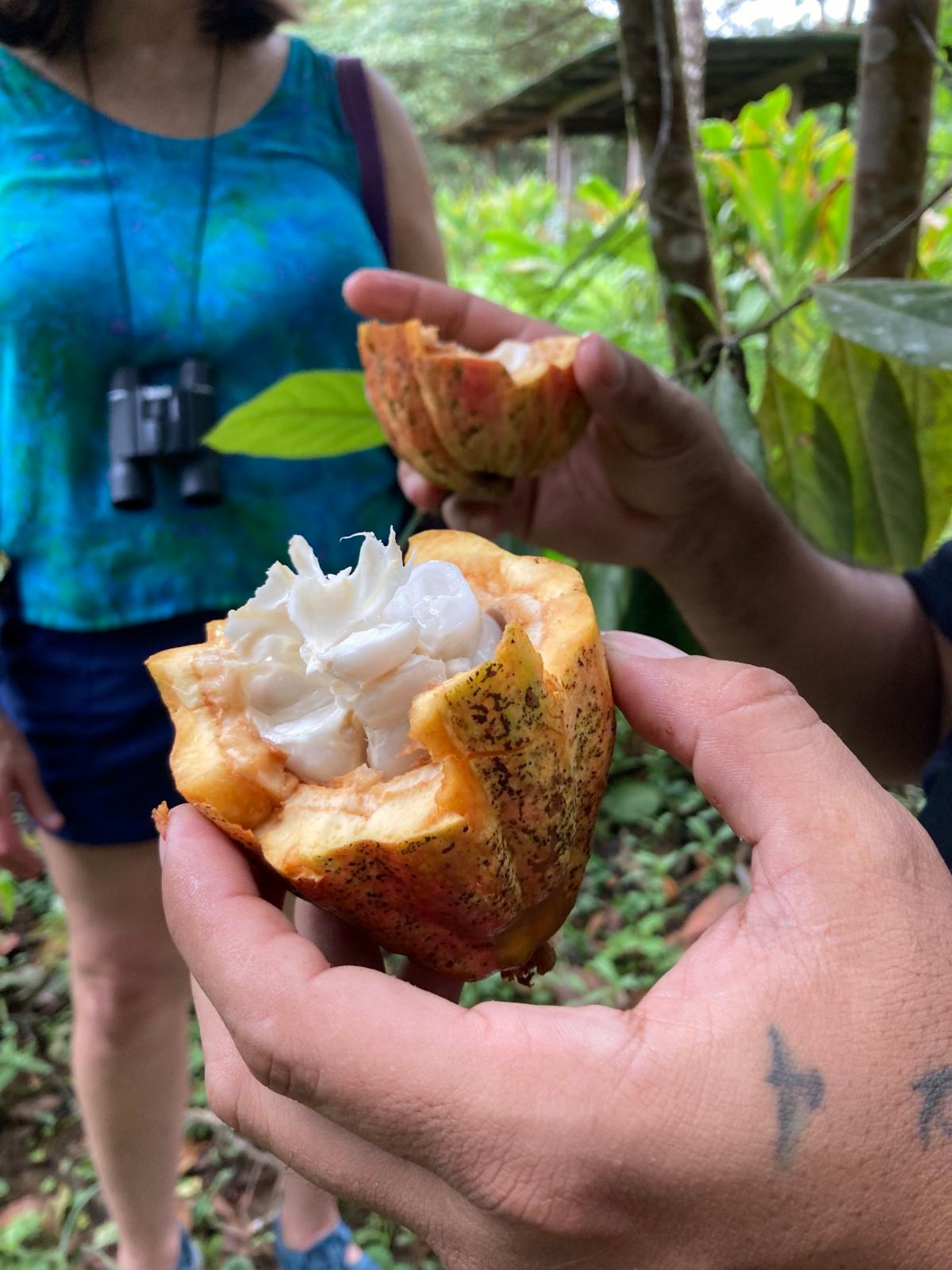 After the fruit pods are harvested in the morning, the cocoa beans are fermented in the open air on the ground covered with banana leaves. Next, they are dried in the sun, being turned often for between two and nine days, then toasted and roasted for the chocolate taste we all know and love.