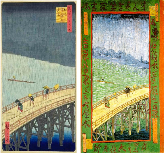 by Japanese artist Hiroshige (left), and Vincent Van Gogh's version of the print (right).