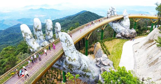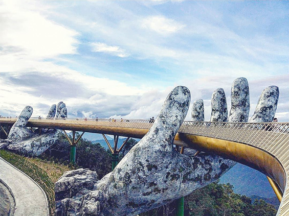 and to provide a scenic overlook and tourist attraction. The bridge loops nearly back around to itself, and has two giant stone hands designed to appear to support the structure.