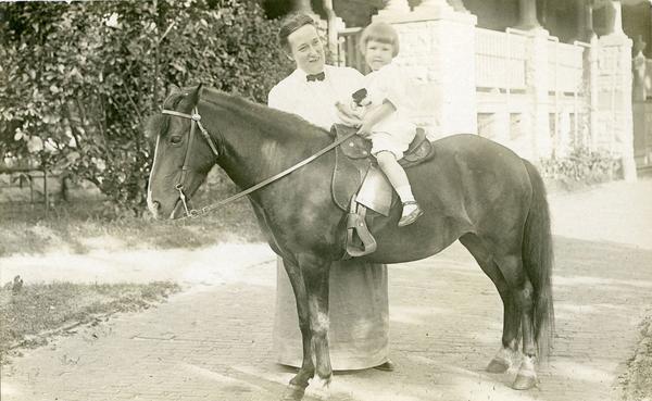Nancy Reynolds on horse in front of Fifth Street house, c. 1912. Estate Archives.