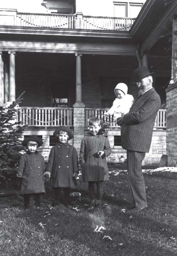 R.J. Reynolds and children in front of the Fifth Street house. c. 1913. R. J. holds his youngest child, Smith, in his arms. Nancy, Mary, and Dick (left to right) stand nearby.