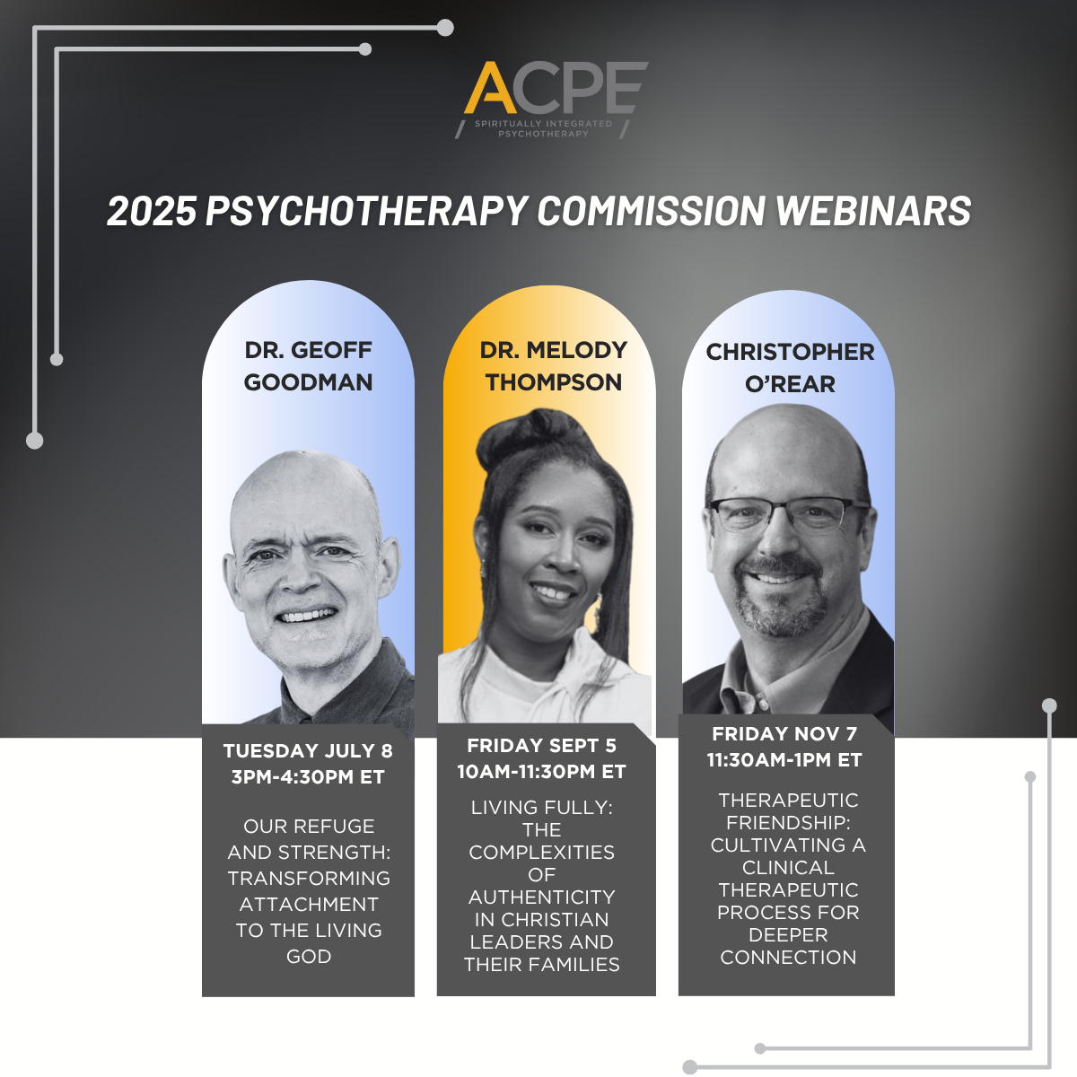 This gathering of ACPE’s Psychotherapy Community offers space for therapists, pastoral counselors, and spiritually curious clinicians of all backgrounds to explore the sacred terrain where knowing gives way to mystery and the hunger for meaning becomes central in the healing journey.