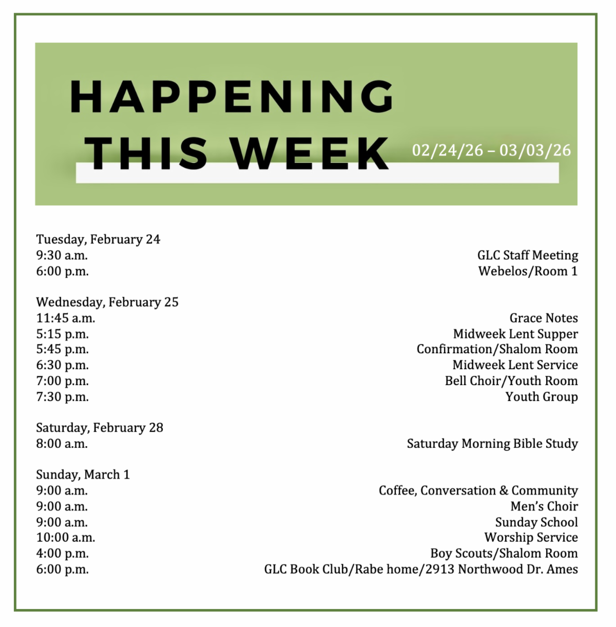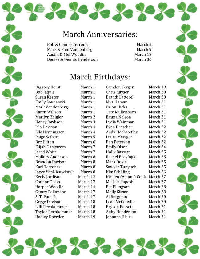 THE TLC COORDINATORS for the next weeks are Gene Upstill (Feb. 15-28), Pam Abarr (March 1-15) and Deb Anderson (March 16-31).