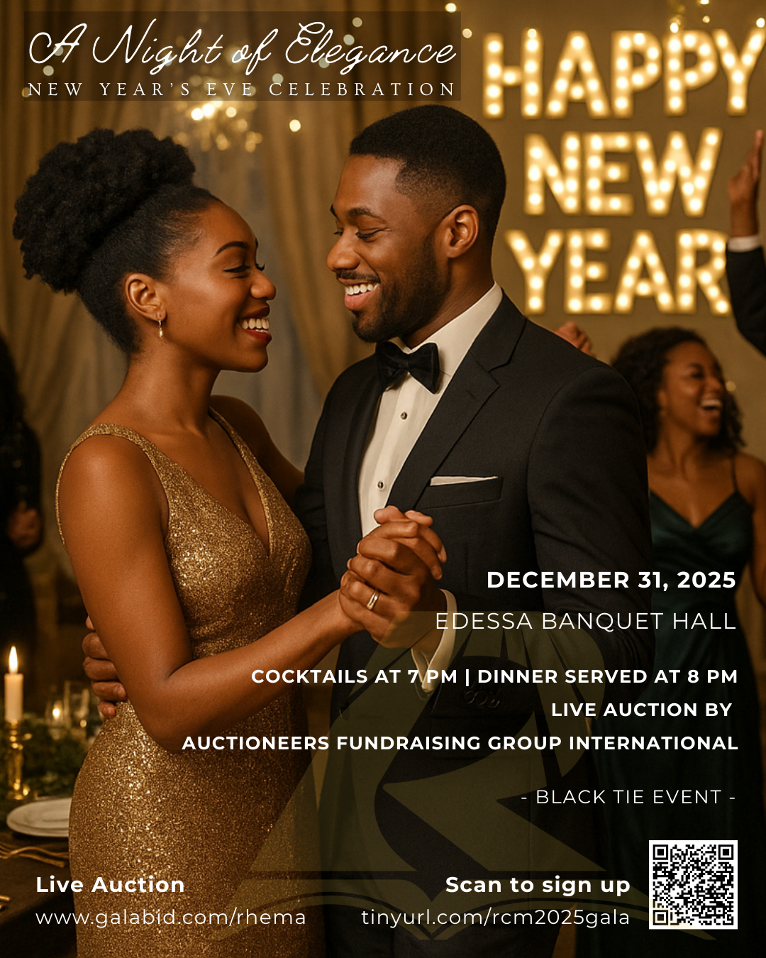 | | Join us for an unforgettable evening of elegance and celebration as we usher in the New Year at Rhema’s 2025 Year-End Gala on New Year’s Eve. | | The evening will feature a formal three-course dinner served at 8:00 pm, along with music, dancing, a silent auction, and a door prize. We warmly welcome you, along with your family and friends, to share in this festive occasion as we bid farewell to 2025 and step into 2026. | | | |