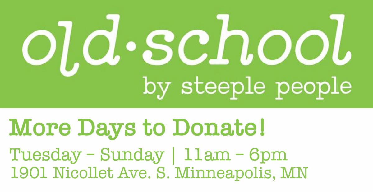 Old School by Steeple People is now accepting donations every day we are open, Wednesday–Sunday between the hours of 11am and 5pm.