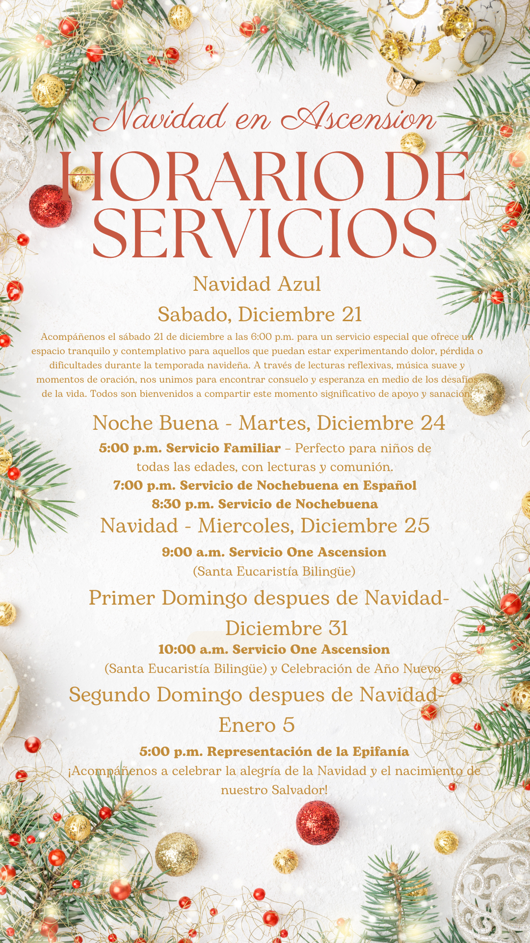 Únete a nosotros para un Servicio de Navidad Azul el sábado 21 de diciembre a las 6:00 p.m. Esta reunión especial ofrece un espacio tranquilo y contemplativo para quienes pueden estar experimentando duelo, pérdida o dificultades durante la temporada navideña. A través de lecturas reflexivas, música suave y momentos de oración, nos reunimos para encontrar consuelo y esperanza en medio de los desafíos de la vida. Todos son bienvenidos a compartir este tiempo significativo de apoyo y sanación.