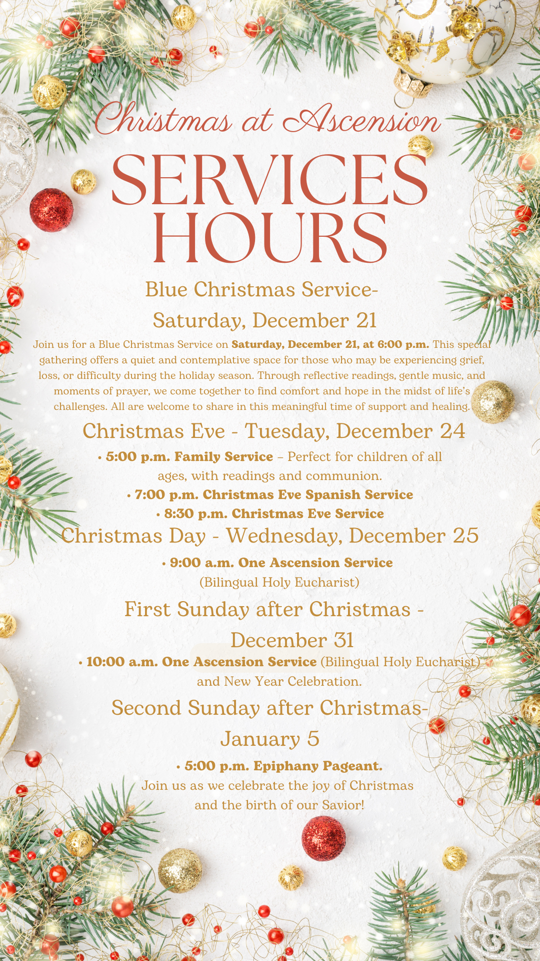 Acompáñanos el domingo 29 de diciembre para un servicio 1-A, seguido de una hora de café festiva. ¡Reunámonos para compartir el espíritu navideño! Trae algo para compartir y únete a nosotros en el salón parroquial después del servicio. Para preguntas o más detalles, contacta a Janet - bkmechanical@aol.com.