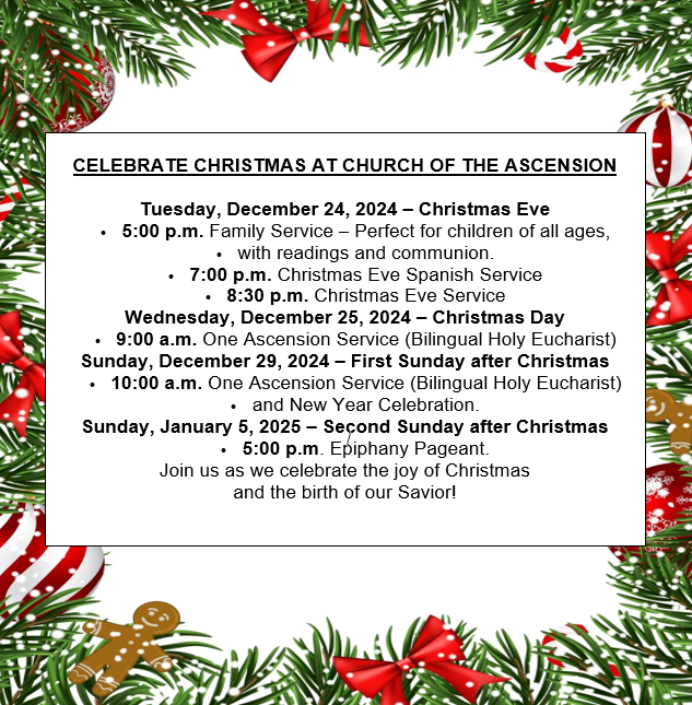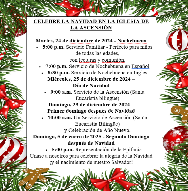 Acompáñenos el domingo 29 de diciembre en un servicio especial de Una Ascensión (1-A), seguido de una hora de café festiva. ¡Reunámonos para compartir un poco de alegría navideña! Por favor, traiga algo para compartir y únase a nosotros en el salón parroquial después del servicio. ¡Esperamos celebrar con usted!