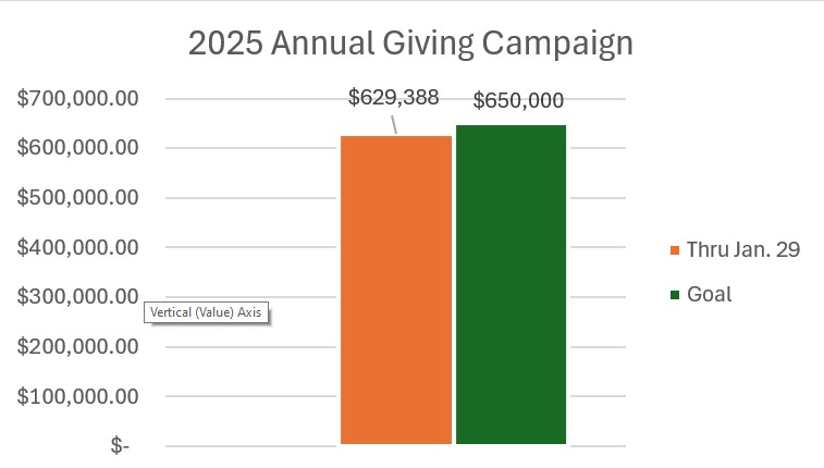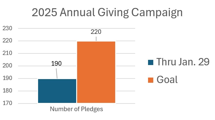 As of January 29, we have received 190 pledges (86% of potential giving units) for over $629,388 (almost 97%) toward our goal of $650,000 for 2025. To those who have already pledged, we thank you. There is still time to make your pledge count for 2025 to help First Church continue to provide the services for our community and beyond.