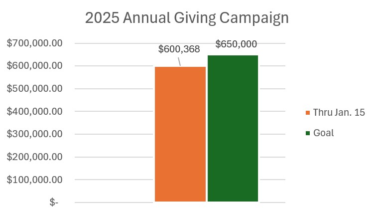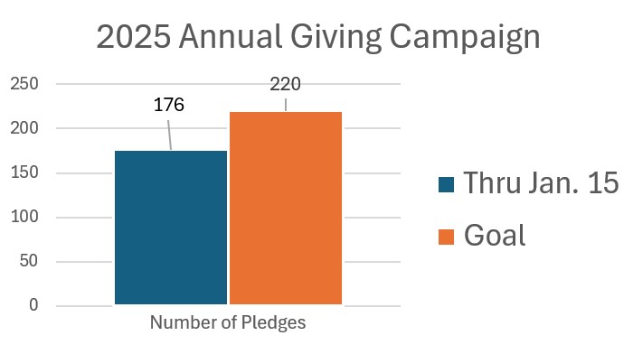 As of January 15, we have received a total of 176 pledges which represents 80% of our goal. These pledges amount to $600,368 which means we have reached the 92% mark towards our goal of $650,000. To those who have already pledged, we thank you. There is still time to make your pledge count for 2025 to help First Church continue to provide the services for our community and beyond.