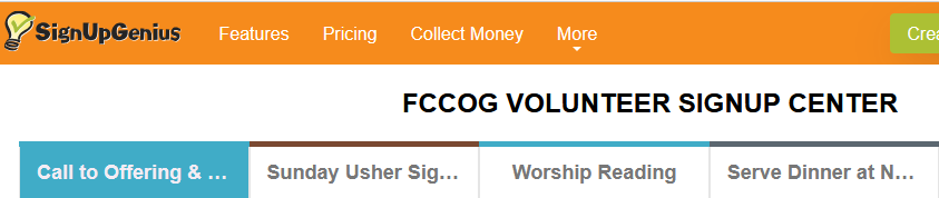 We have a sign-up-page to read scripture, usher, or read a call to offering. All of the previous individual pages are now combined in one, with tabs at the top of the page to flip between each signup.