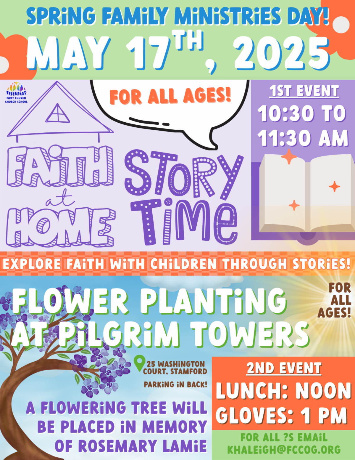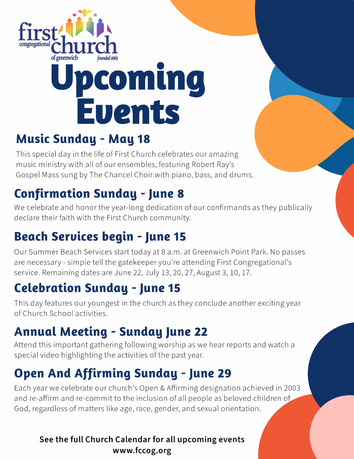 Where: 108 Sound Beach Ave, Old Greenwich. Enter the church’s parking lot from Forest Avenue and park anywhere. Please give the parents dropping off their children lots of room.