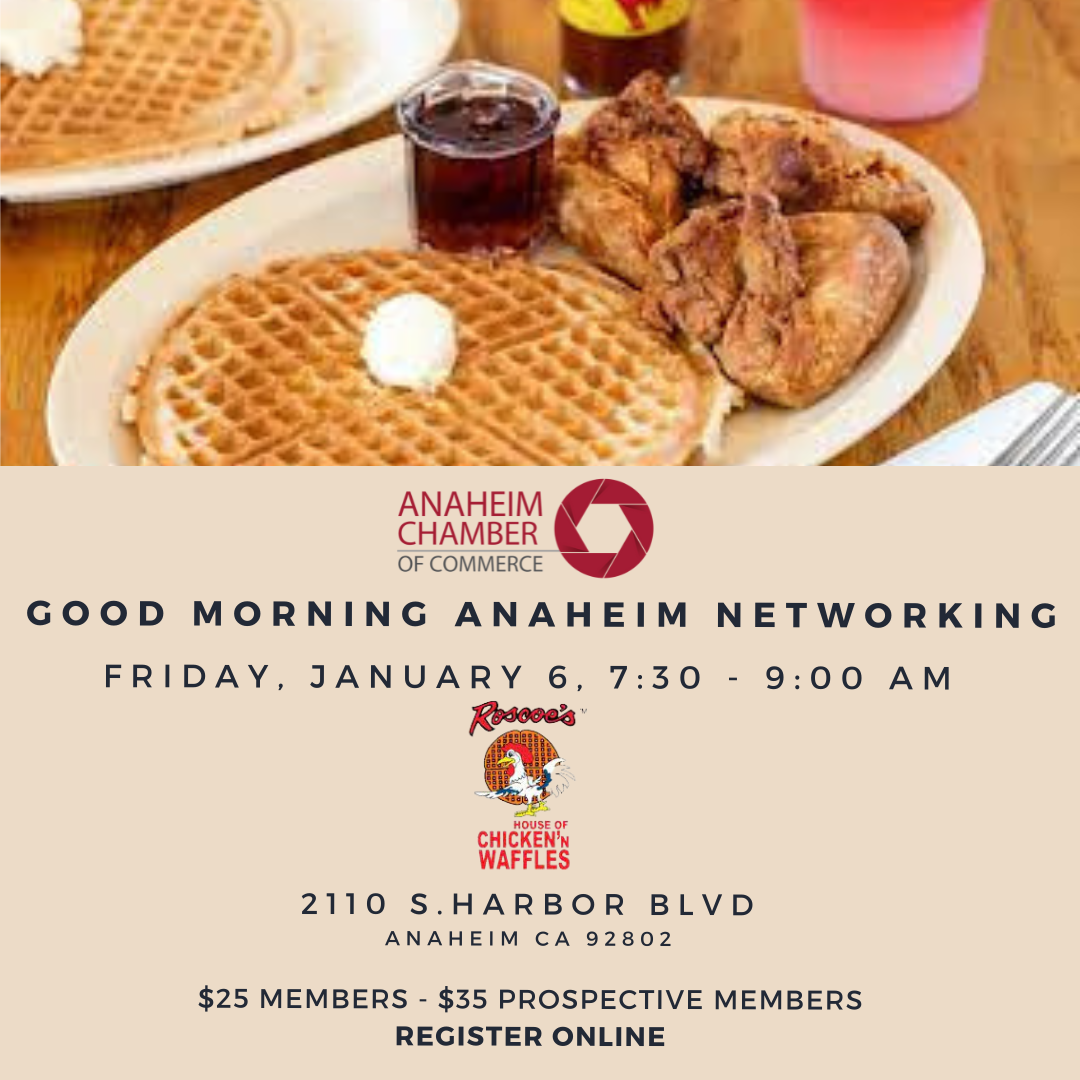 Happy New Year! Join the first networking event of the year with the Anaheim Chamber on Friday, January 6, 2023, at Roscoe's House of Chicken N' Waffles.