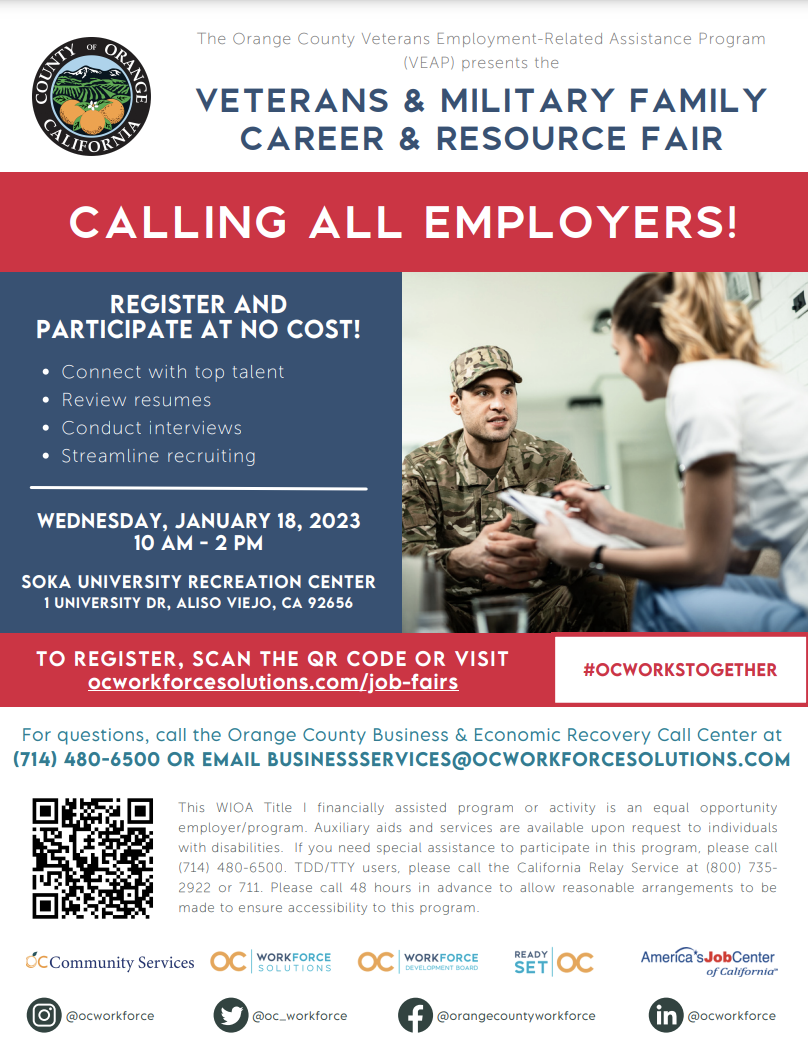The Orange County Veterans Employment-Related Assistance Program is hosting the Veteran/Military Family Career & Resource Fair. The fair will take place on Wednesday, January 18th from 10 am–2pm at the Soka University Recreation Center. The event will host Orange County Employers and Veteran Resources and is open to the public.