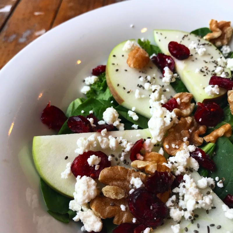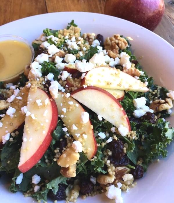 massaged kale and baby spinach, sliced Jersey's Macoun Apples, chia seeds, dried cranberries, toasted walnuts, and goat cheese drizzled with homemade honey balsamic vinaigrette $19.25. Add marinated grilled chicken $6.95, all-natural roasted turkey $8.45, or salmon $10.95.