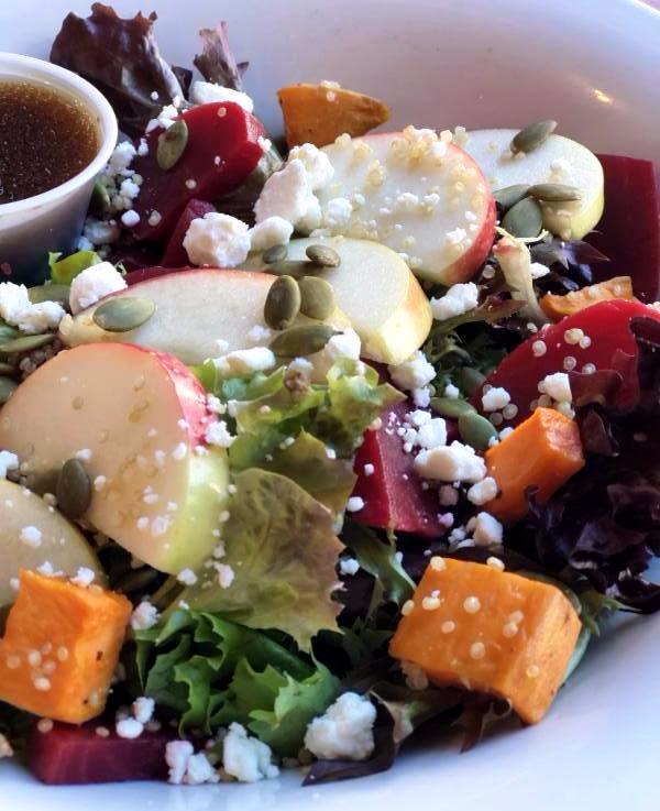 mixed greens topped with sliced Macoun Apples, roasted sweet potatoes, beets, sprinkles of quinoa, pumpkin seeds, and crumbled goat cheese drizzled with our signature honey balsamic vinaigrette $19.95. Add marinated grilled chicken $6.95, all-natural roasted turkey $8.45, or salmon $10.95 (see picture above). | |