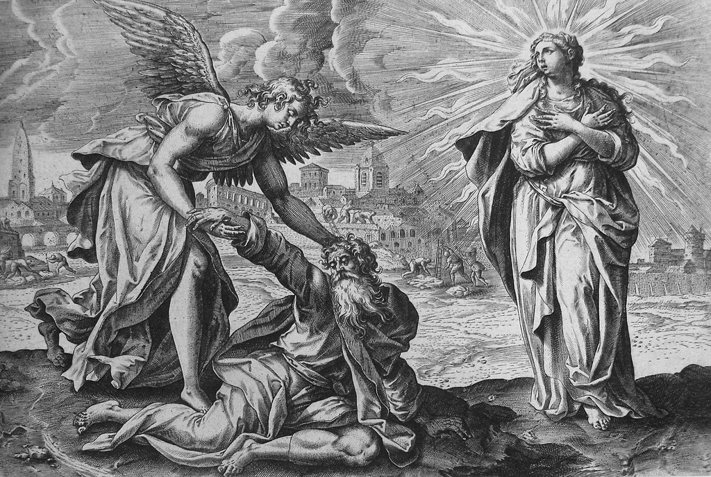 “Ab angelo consolationem accipit Esdras interpretationeq.” by Gerard de Jode, ca. 1580, Antwerp. Engraving for a historical Bible atlas.
