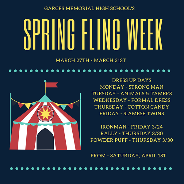 Spring Fling Week is a circus theme this year and we have lots planned! Iron Man is tonight in the gym at 7:30 and we are hoping for a full house. There is no cost to attend and the juniors and seniors would love to play in front of a large crowd. Mr. Mark Brown will be our play by play commentator and he always makes it more fun for everyone involved. Last year the senior class won as juniors and they are hoping for back to back victories!