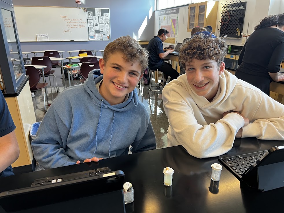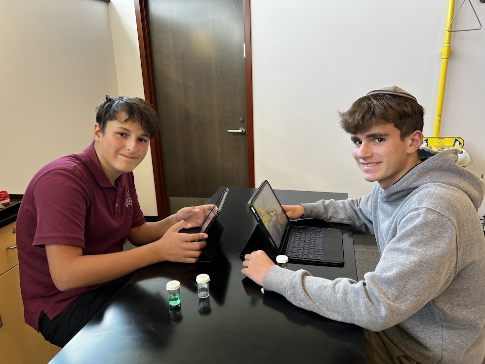 | | Aryeh Lowenthal and Ayden Starck | | Gabriel Nudman and Bentzion Beiles | | Yehuda Weiss and Asher Gadd | | Mrs. Chavee Gottlieb's 10th Grade Honors Chemistry Class | | Sophomores are learning how to make detailed observations of chemicals. | |