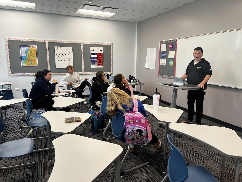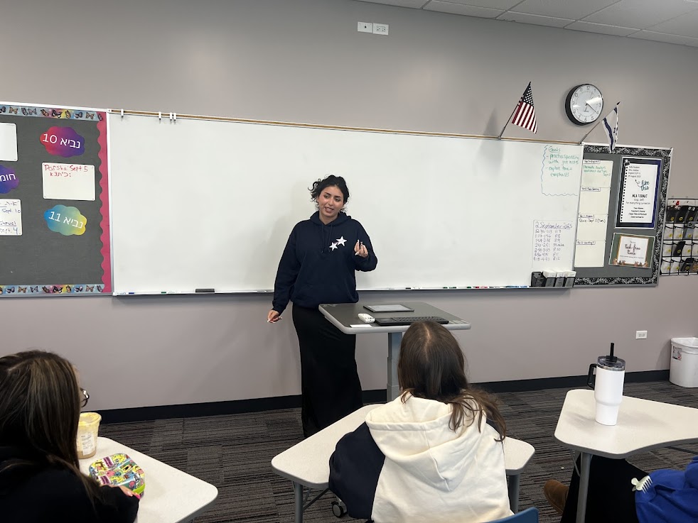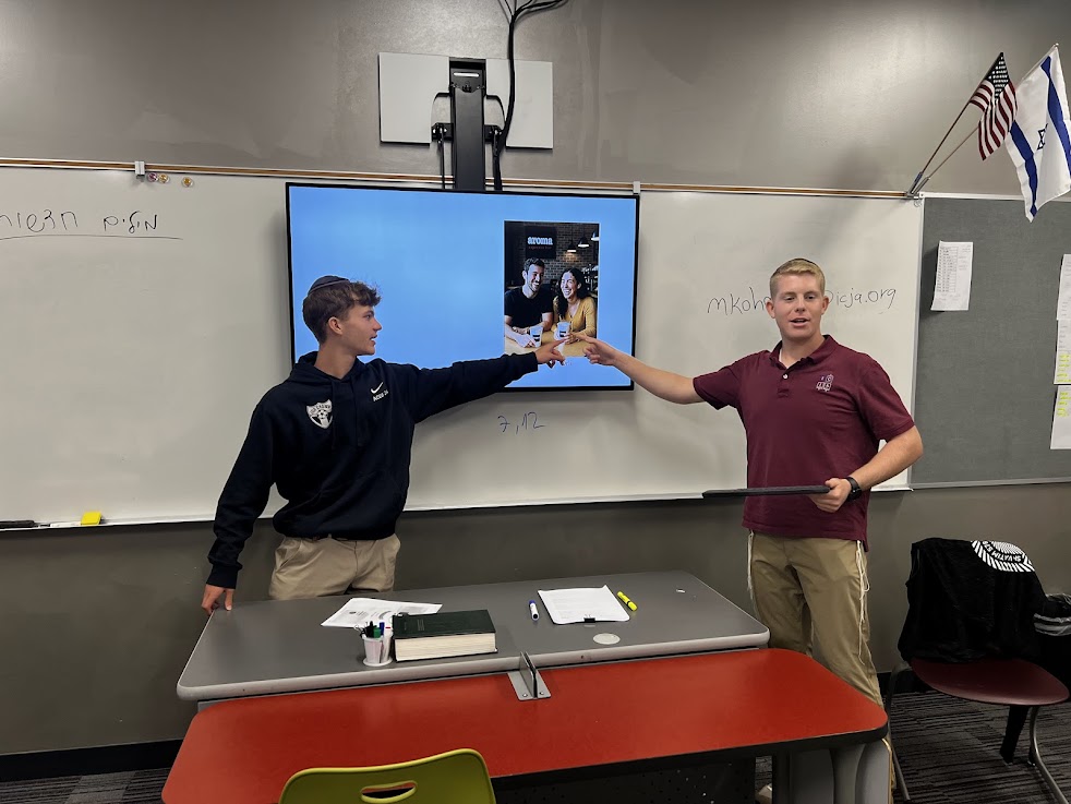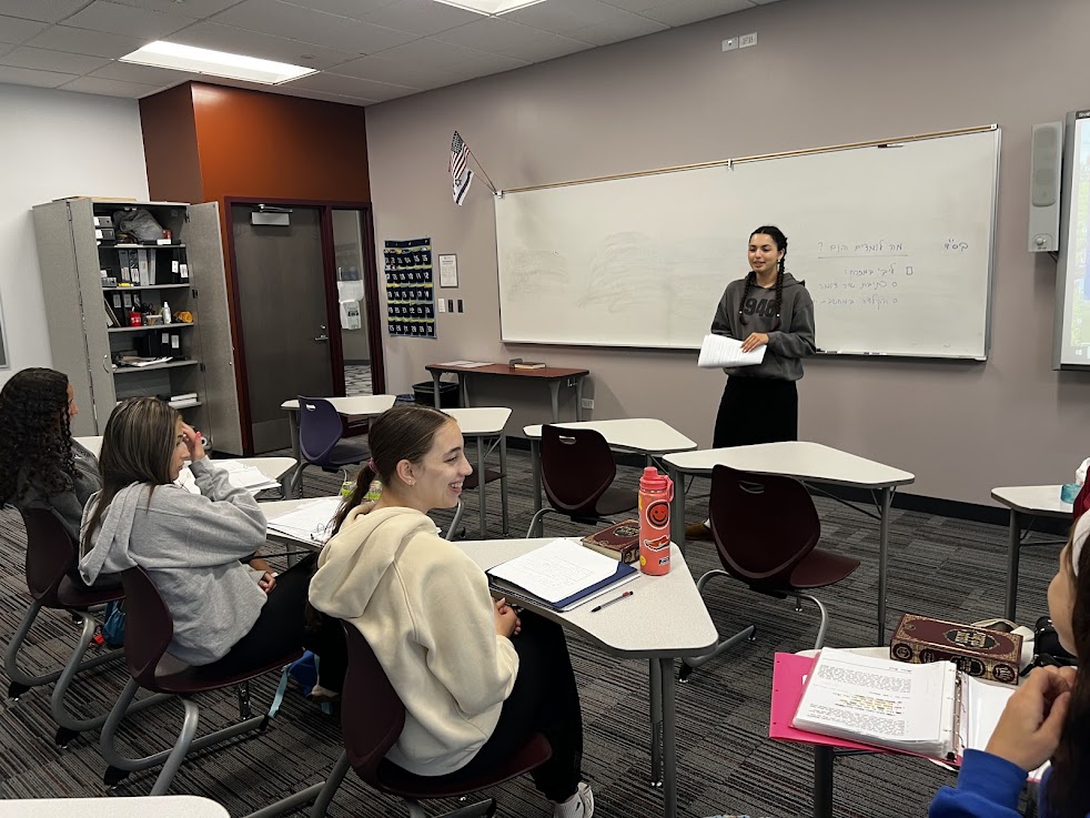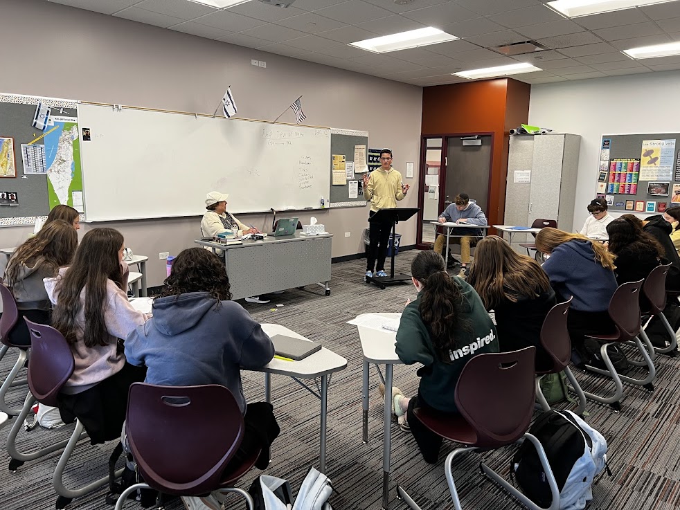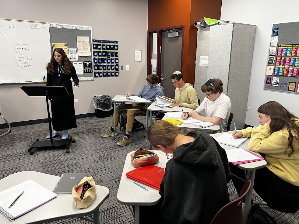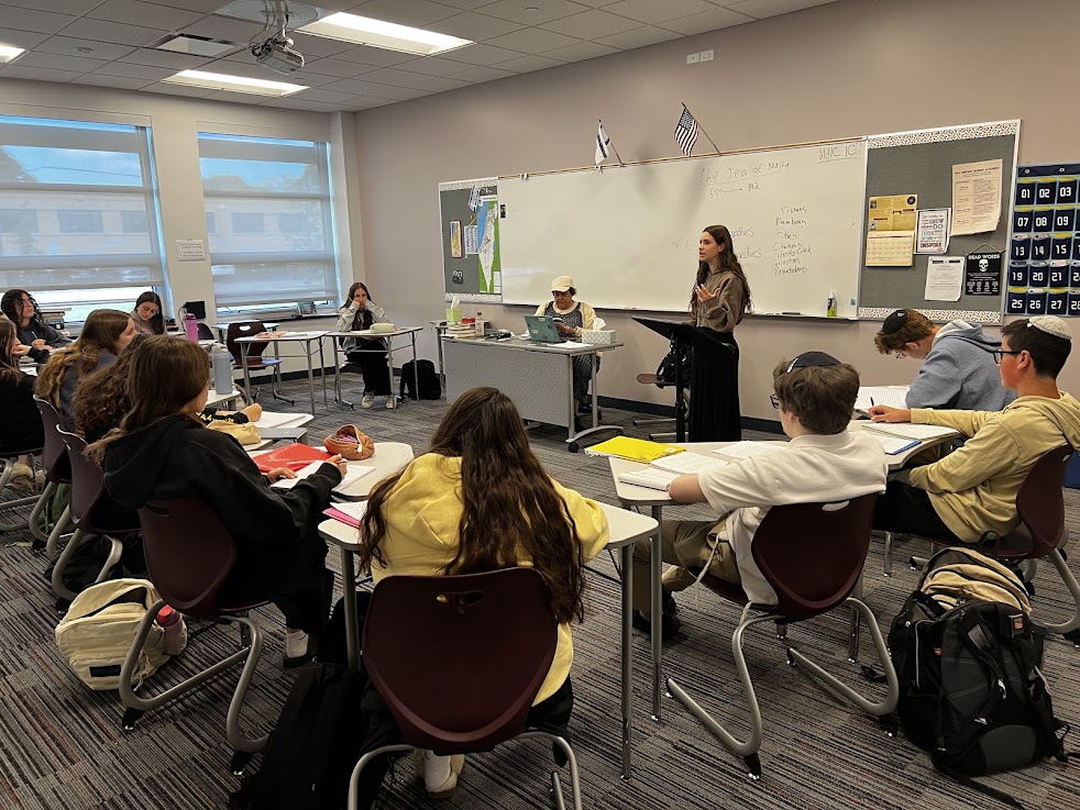 | | Yis Burgher and Jordan Rich | | Ronit Kinar, Michal Belsh, and Adi Gryka | | Jonah Krule and Asher Segal | | Mrs. Heather Hobbie's Public Speaking Class | | Students shared persuasive speeches. | Can you talk smoothly for several minutes without hesitating or saying "um" at all? Seniors in Mrs. Heather Hobbie's Public Speaking class can. This week students took turns giving amusing speeches to their peers in an animated, polished way. | | Jessica Michaeli arguing that listening to music can be an addiction | | Jonah Glass persuading his classmates that hockey is the best sport | | Elisheva Deangelis arguing that pineapple pizza is cultural appropriation | | Mrs. Tirza Kahan's AP Language Class | | Juniors educated their peers about Jewish life in Shakespeare's time. | | |