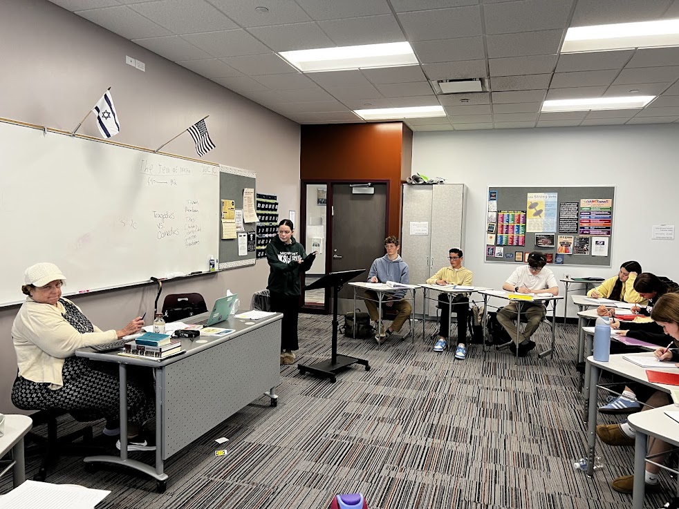 Juniors in Mrs. Tirza Kahan's AP Language class are preparing to read The Merchant of Venice. This week, they prepared by taking turns teaching their peers about different aspects of life, particularly the life of Jews, during Shakespeare's lifetime.