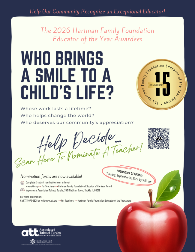 | | BIG NEWS FOR 2026! Hartman Family Foundation Educator of the Year Award amounts have increased! - Now accepting nominations! Help our community recognize an exceptional educator! Visit The Hartman Family Foundation Educator of the Year Award (att.org) to complete a user friendly, online nomination form, download a paper nomination form, and see rules, or call 773-973-2828 for more information. Nomination submission deadline: Tuesday, September 16, 2025, by 5:00 p.m. | | |