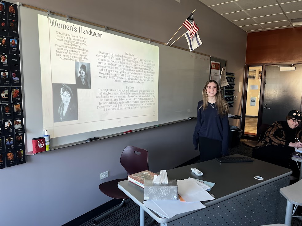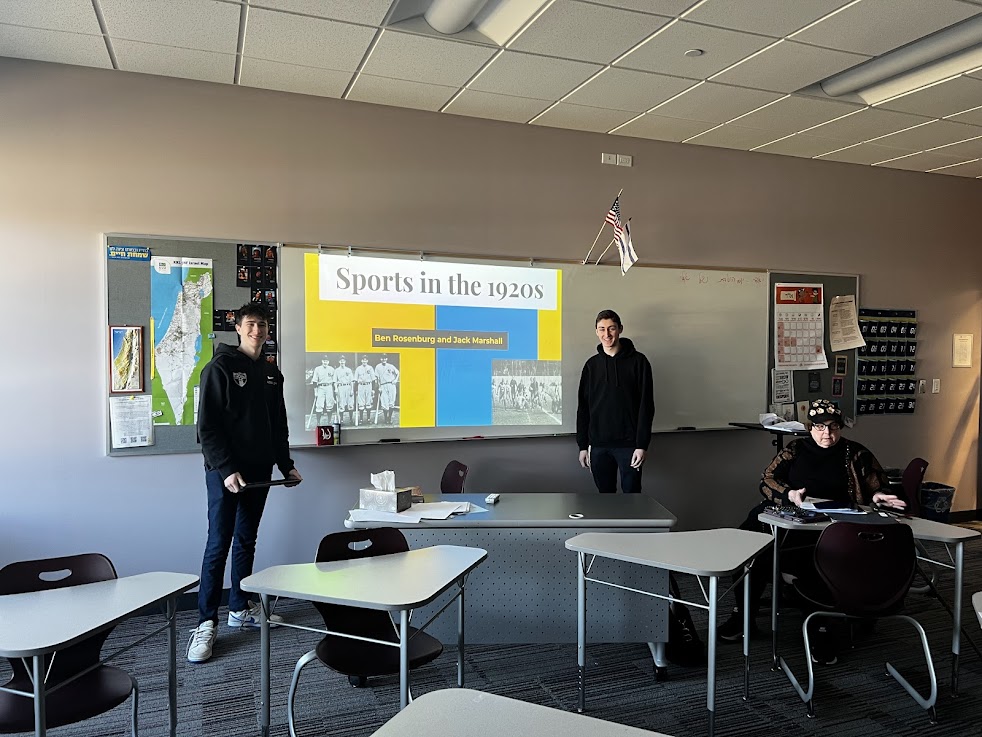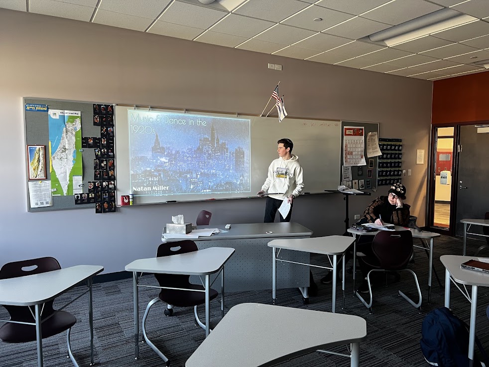| | Pictured above: Adi Gryka, Amalia Strosberg, Dana Stein, and Ronit Kinar with Mrs. Alissa Zeffren | | Pictured above: Michal Belsh as Rashi and Miriam Linzer as Malbim | | Pictured above: Emily Adler, Ronit Kinar, Adi Gryka, Dana Stein, Michal Belsh, Amalia Strosberg, and Miriam Linzer | | Mrs. Tirza Kahan's AP Language Arts Class | | What was life like during the era of The Great Gatsby? | | Juniors in Mrs. Tirza Kahan's AP Language classes read The Great Gatsby. This week, they took turns presenting the results of in-depth research they conducted, teaching their peers about the cultural world of the 1920s to help enhance their classmates' appreciation of the book. | | Pictured above: Elisheva Deangelis explaining changes to men's and women's fashion in the post-World War I era | | Pictured above: Natan Miller discussing music influences and trends in the 1920s | | Pictured above: Jack Marshall and Ben Rosenburg explaining how the rise of radio helped increase the opularity of sports, particularly baseball and college football, in the 1920s | | Mrs. Marsha Arons's 10th Grade Honors English Class | | Students welcomed disability advocate and author Mrs. Michelle Friedman '75 | | |