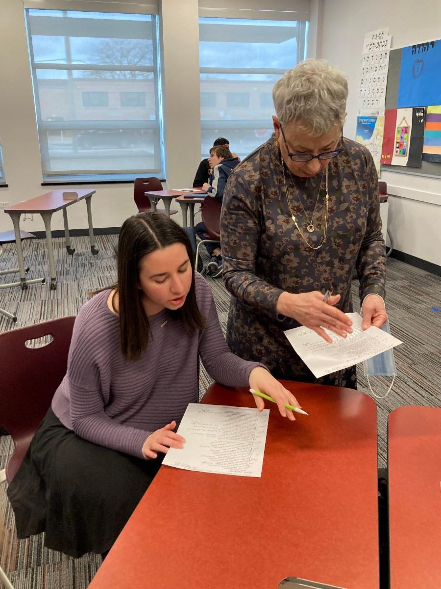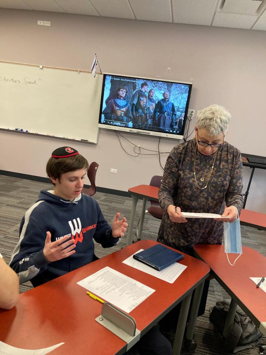 Pictured below: seniors Tamira Halpert, working with Ms. Goldstein on preparing to deliver the speech to a large crowd, and senior Eliezer Zagorin, working with Ms. Goldstein as part of the group reading the play's lines in a small, intimate setting.