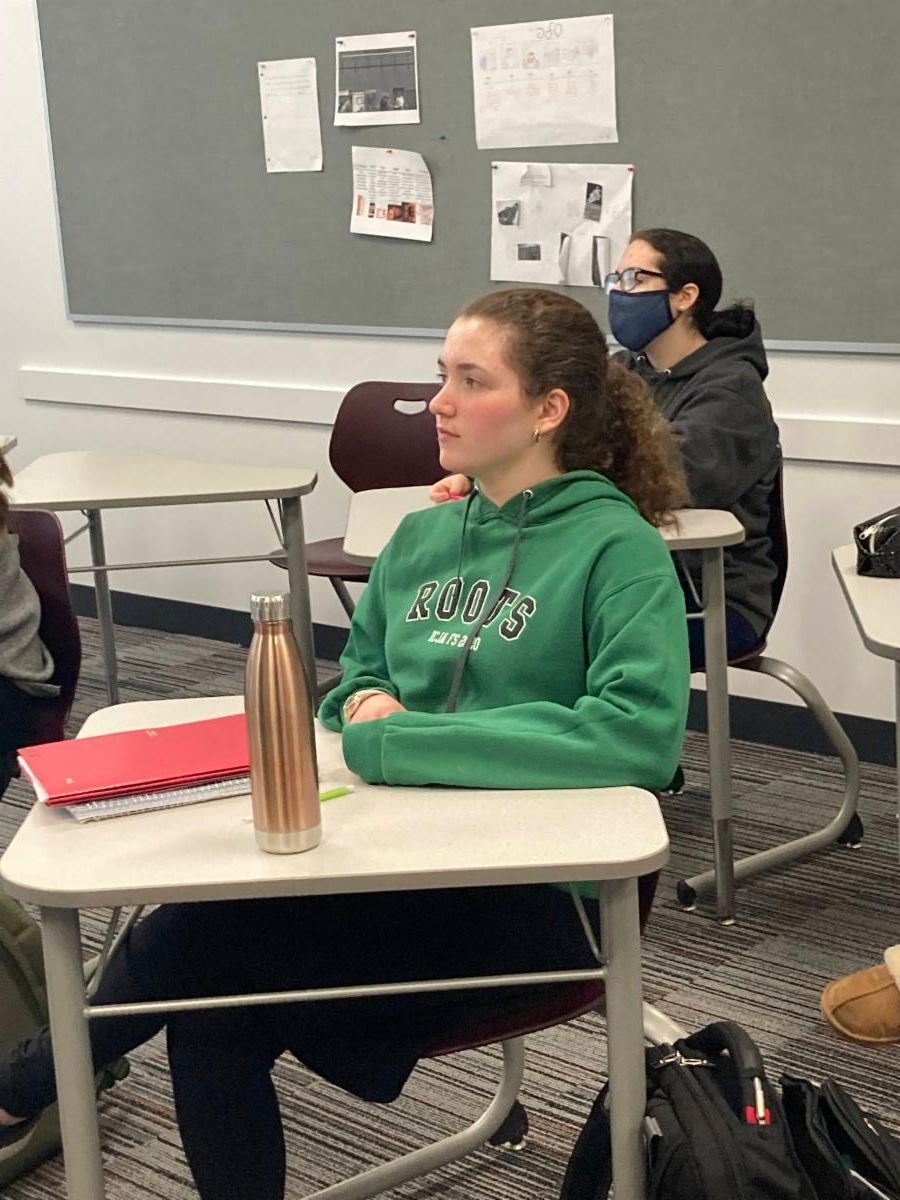 Pictured below: students watching the news, and Charli Ernstein preparing to answer a question.