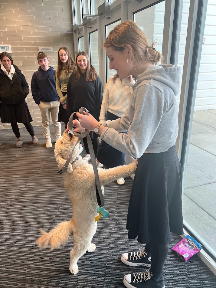 Pictured above: Dena Simon illustrating how to train her dog, Murphy | |