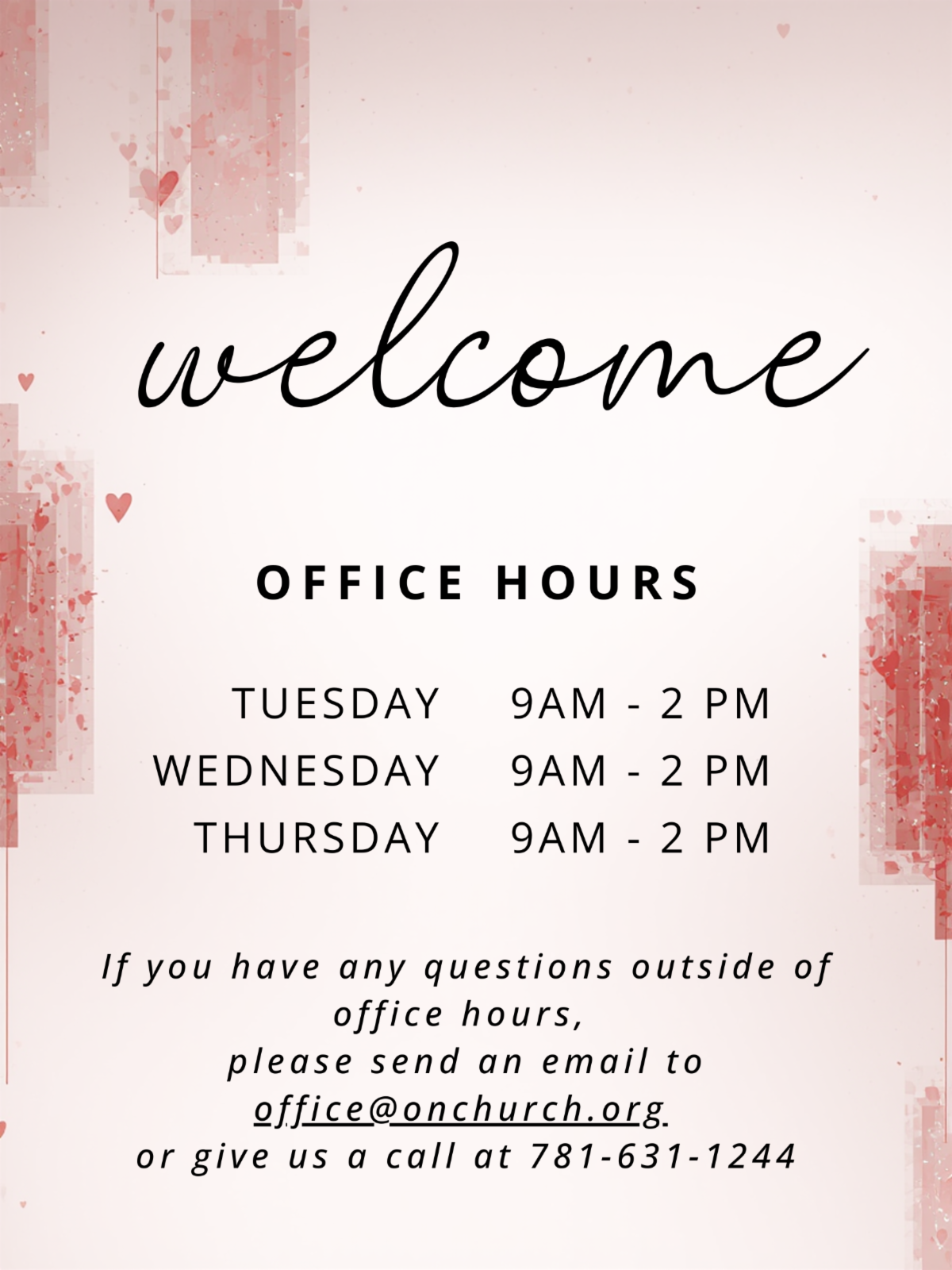 | | Accessing Rev. Lindsay’s Calendar | | Rev. Lindsay is available to meet with you for pastoral care, to discuss church matters, or simply to get to know you. You can schedule time with her at calendly.com/lindsaypopper .You may reach Rev. Lindsay at her email address, lindsay@onchurch.org or at 781-631-1244 x102 | | Accessing Rev. Christine’s Calendar | | You can access Rev. Christine’s calendar online as well to schedule time with her: https://calendly.com/christine-hribar. She can be found in her office location in the Stacey Street office known as the “Beals Room” (across from the Great Room). Rev. Christine may also be reached at her email address, revchristinehribar@gmail.com or at 781-631-1244 x105 | |