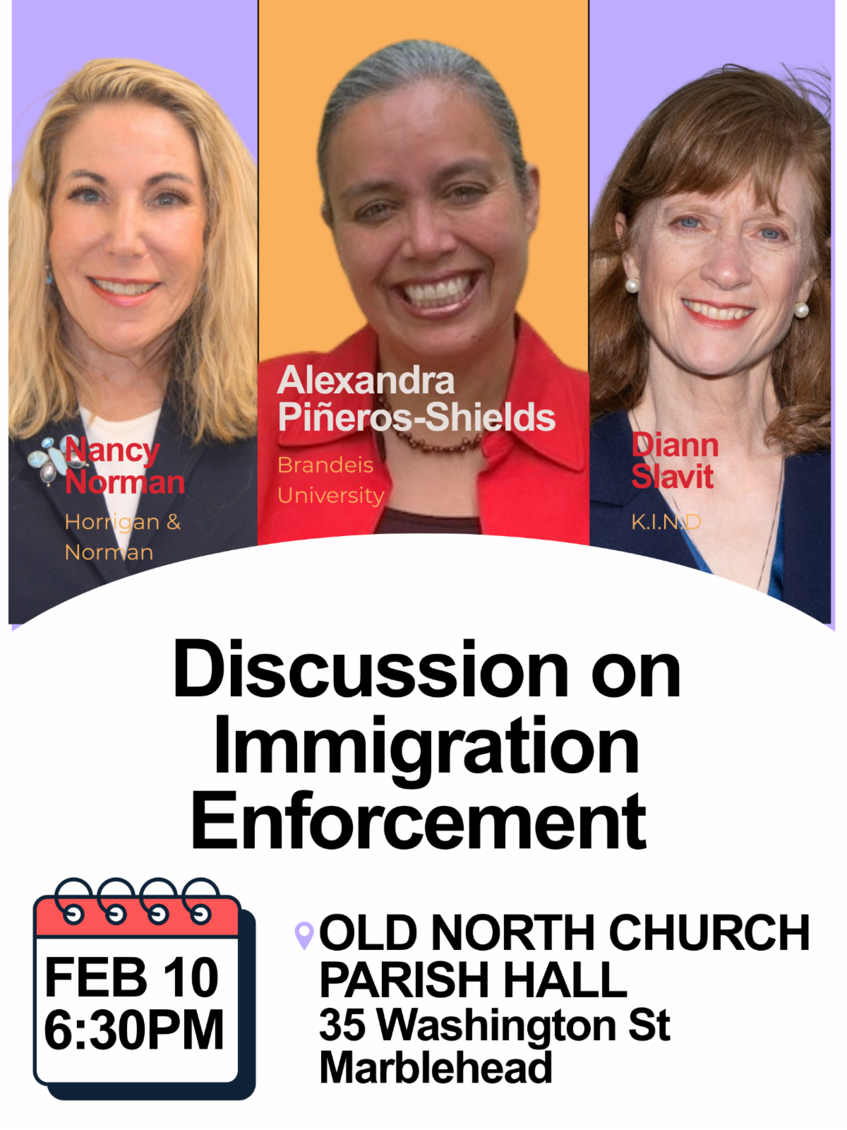 Diann Slavit Baylis and Nancy Norman, two immigration attorneys that live in Marblehead, along with Alexandra Piñeros Shields, who directs the MA Public Policy Program at Brandeis, will lead a community discussion about how the community can get involved in helping local immigrants.