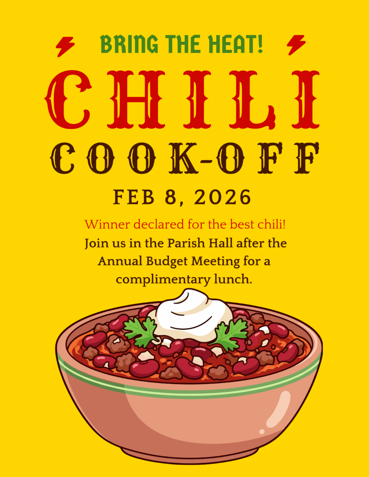 | | The Annual Budget Meeting on February 8 will be followed by our always popular- and competitive- chili cook-off in the Parish Hall for members and families. We will be doing some new and interesting things at the church meeting this year, and invite all members to come participate and contribute to the meeting and the chili lunch. Children are welcome to remain in Sunday School or the nursery, which will remain open for the duration of the meeting. | |