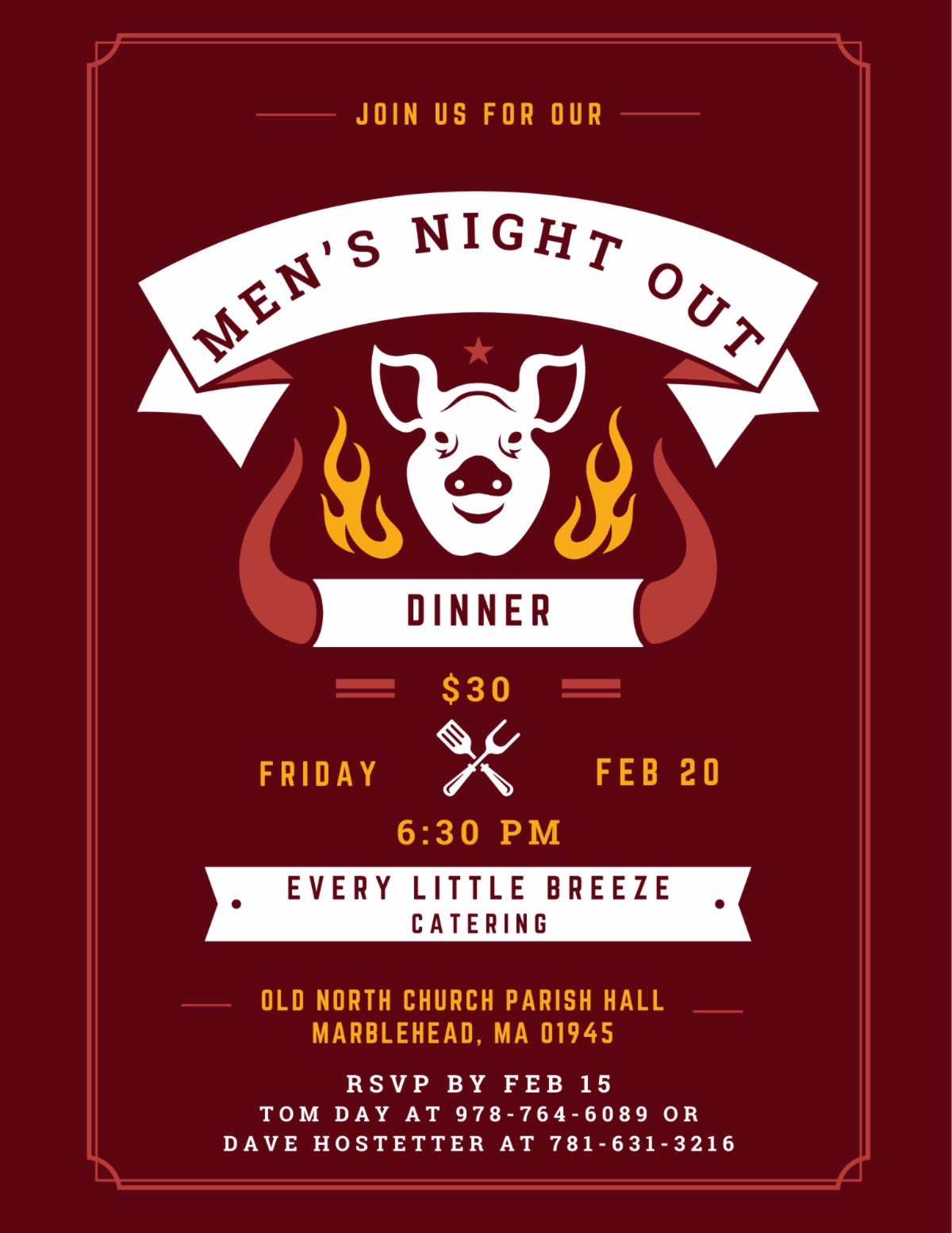 The Men's Night Out dinner is planned for Friday night, Feb. 20 in the Parish Hall. We will gather at 6:30 PM and start dinner at 7 PM. The dinner will be catered by Louise Moore of "Every Little Breeze Catering". On the menu we have ribs, pulled pork, cornbread, rolls, mac & cheese, coleslaw and brownies. We'll have water and a few soft drinks. If anyone wants beer or wine, please bring it for yourself. There is a $30/person cost for the dinner. The cost must be prepaid. The cut-off date for reservations is Feb. 15. Men can make reservations at coffee hour after the 10AM worship service or by contacting Tom Day at 978-764-6089 or Dave Hostetter at 781-631-3216. This is a really nice social event for men.