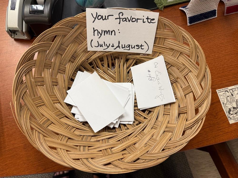 Have a favorite hymn you’d love to sing? Drop the title in the basket on Vicki’s desk—we’d love to include it!
