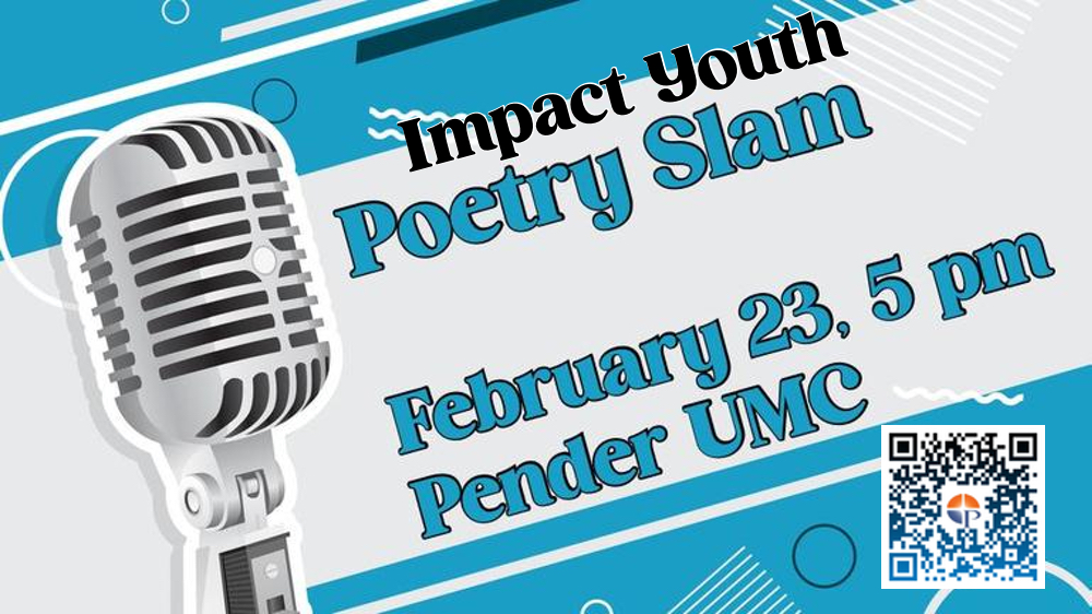Entries can be submitted electronically with this poetry slam application completed to Pender United Methodist Church OR mailed to Pender United Methodist Church, 12401 Alder Woods Drive, Fairfax, Virginia 22033, or dropped off at the church office.