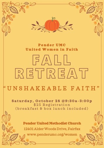 Please join us on Saturday, October 28 from 9:30 to 3:00 PM at Pender United Methodist Church for a powerful women's retreat enabling you an opportunity to engage in corporate and individual worship and prayer.