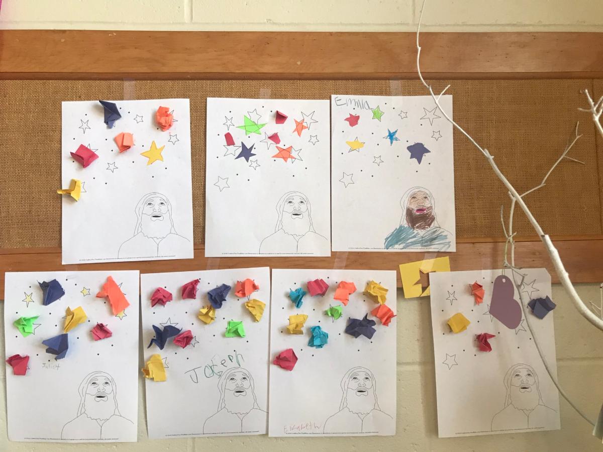 Last week the children all had a good time learning about the many ways saints, including them, can shine light. We read the story of God promising Abhram a great big family, more than stars in the sky, and created our own masterpieces of colorful starry skies.