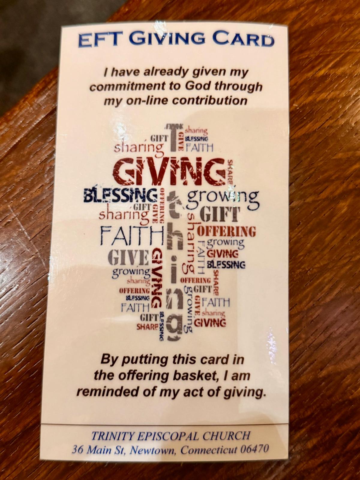 One of the choices on the 2026 Stewardship pledge form is to pay electronically through Vanco. If you aren’t already, why would you want to do this? You’ve noticed people in church calmly reaching for the “EFT Giving Card” in their pew and putting it in the collection basket as it comes by. They aren’t wondering if they are behind on their pledge or thinking about how much to give. They’ve set that up through Vanco. This service lets you connect a bank account or credit card and then make automatic transfers. So once you decide how much you are going to give to Trinity and how often you are going to give it, Vanco does the rest. If you need to make a change, you can easily do that.