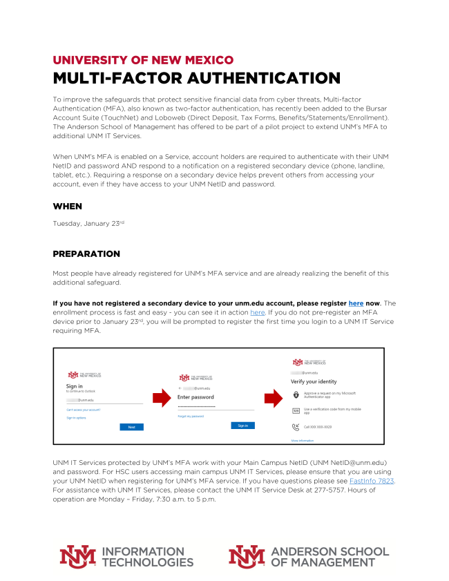 On Tuesday, Feb. 23, Anderson student, faculty and staff accounts will be enabled with UNM’s MFA service for LoboMail, Outlook, Teams and more. To prepare for this transition, please click the image (right) for details and instructions.