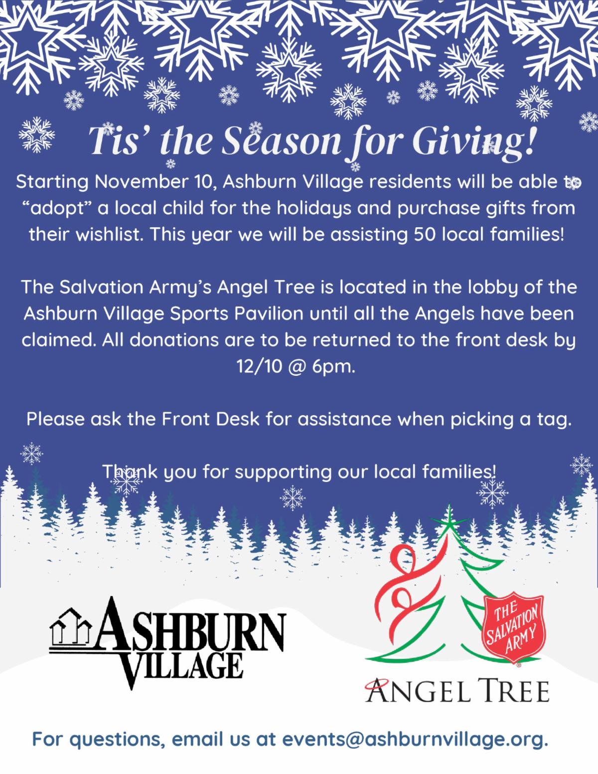 The Salvation Army Loudoun's Angel Tree will be located in the lobby of the Ashburn Village Sports Pavilion until all of the Angels have been claimed. All donations are to be returned to the Front Desk by Wednesday, December 10 at 6:00pm.