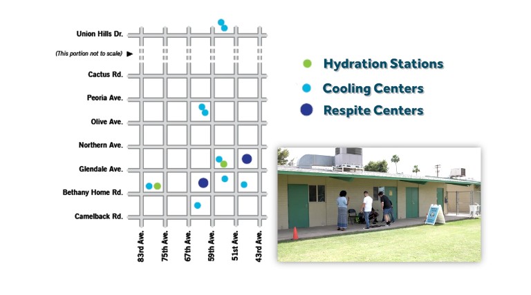 As temperatures rise in the Valley, extreme heat can pose serious risks to residents, especially those without reliable access to air conditioning. To help keep our community safe, the City of Glendale, in partnership with Phoenix Rescue Mission and Arizona Faith Network, offers heat relief resources for anyone in need of water, a cool place to rest, or additional support during the hottest parts of the day.