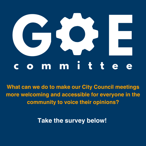 We are seeking input from residents, community groups, and business owners on how to make City Council meetings more welcoming and accessible. Your feedback will help the Government Operations and Efficiency (GOE) Committee explore ways to boost participation and remove barriers to engagement. Let us know: