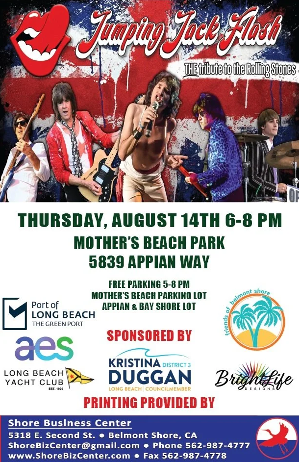 Friends of Belmont Shore Summer Concert – On Thursday, August 14, at Mother’s Beach, the FoBS will host Rolling Stones tribute band Jumping Jack Flash from 6:00 to 8:00 pm. Free and family-friendly.