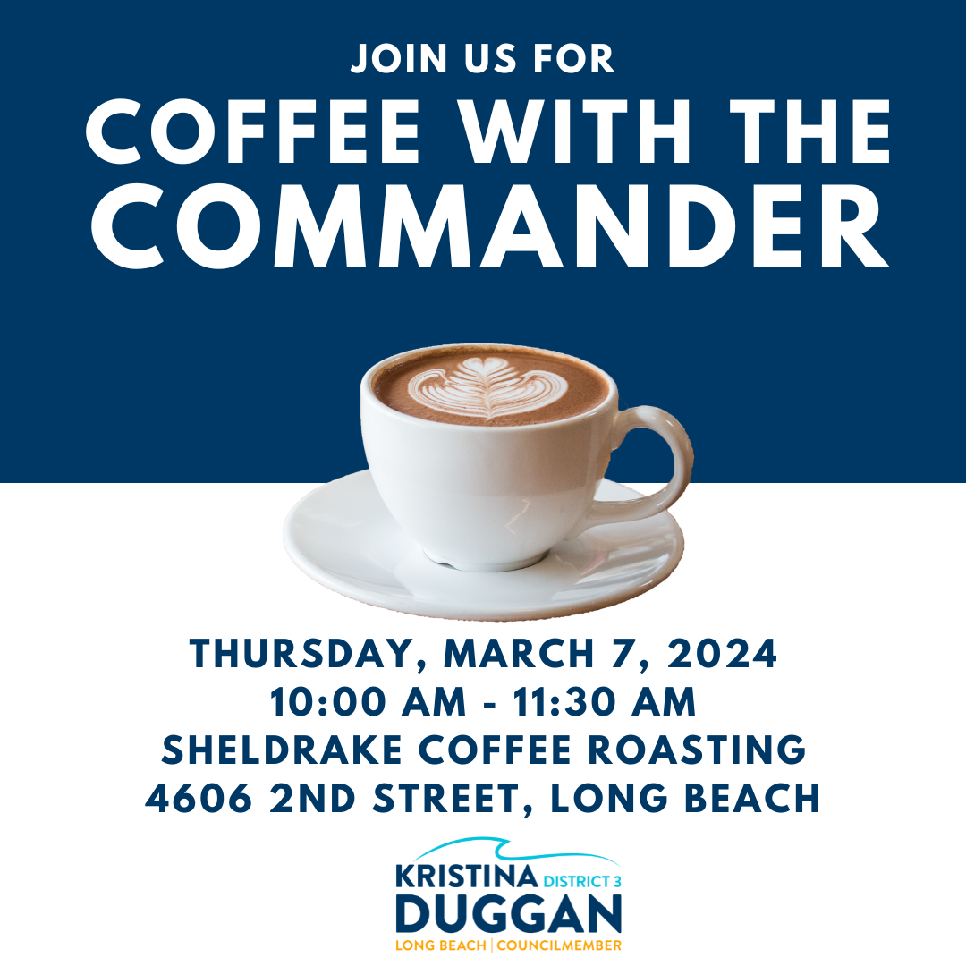 Coffee with the Commander on 2nd Street | In light of recent crimes on 2nd Street, we are holding a Coffee with the Commander at 10:00 am on Thursday, March 7, at Sheldrake Coffee Roasting. I hope to see you there! | | | |