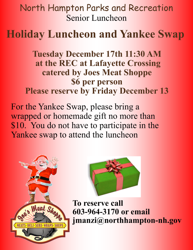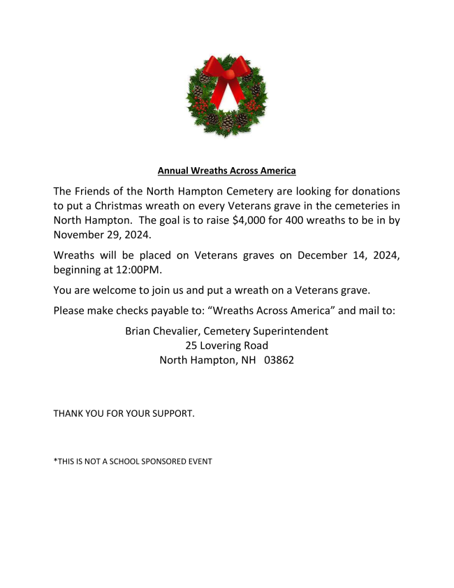 If your family is in need of support this holiday season, please contact Nurse Mara at NHS or Kaitlyn Peacock at North Hampton Fire Station. There is assistance available for toys and groceries.