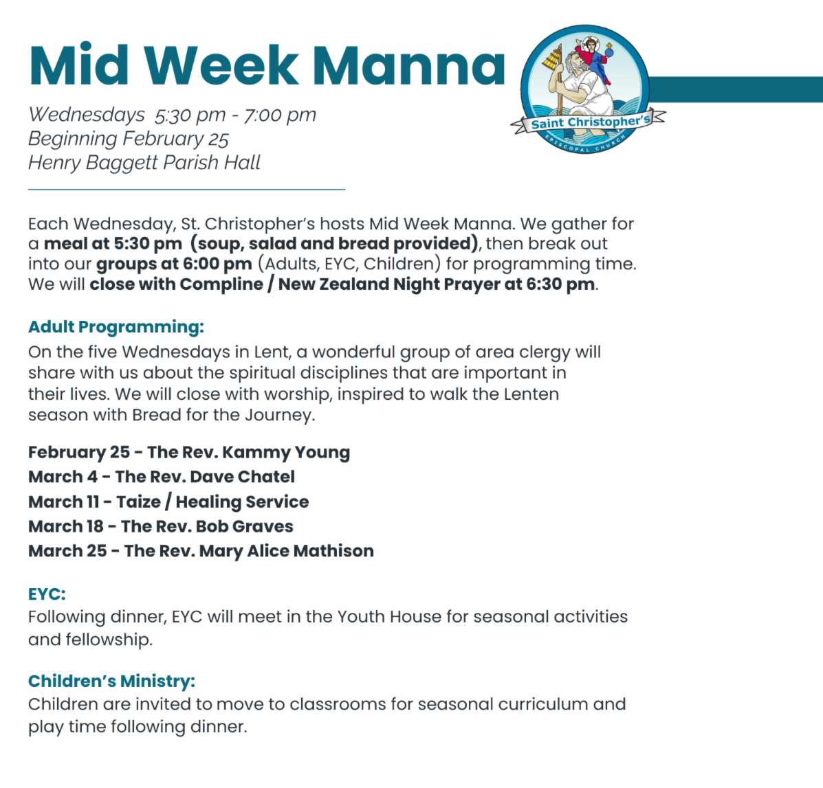 Children's activities through Lent will include seasonal curriculum, including Stations of the Cross, practicing Lent at home, and rehearsing for the Easter Vigil. (After the time change, we will also visit the playground across the street.) Each Wednesday night, all children will meet back up with their families in the Parish Hall at the conclusion of programming to participate in New Zealand Night Prayer with the group. See you tonight!