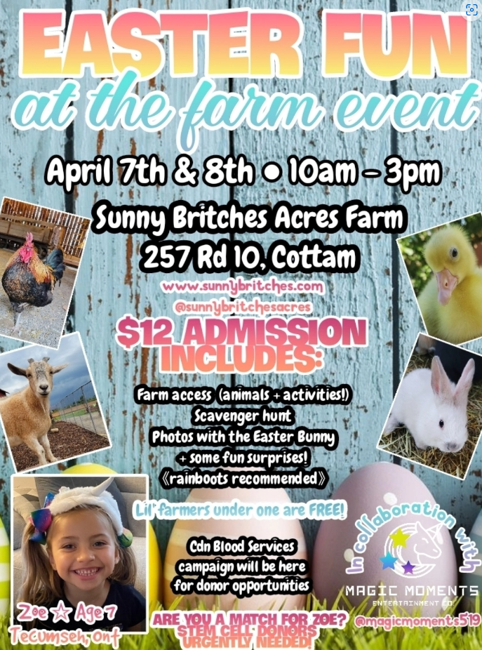 The event takes place at Sunny Britches Acres Farm, 257 Road 10, in Cottam on April 7th and 8th from 10:00am - 3:00pm.